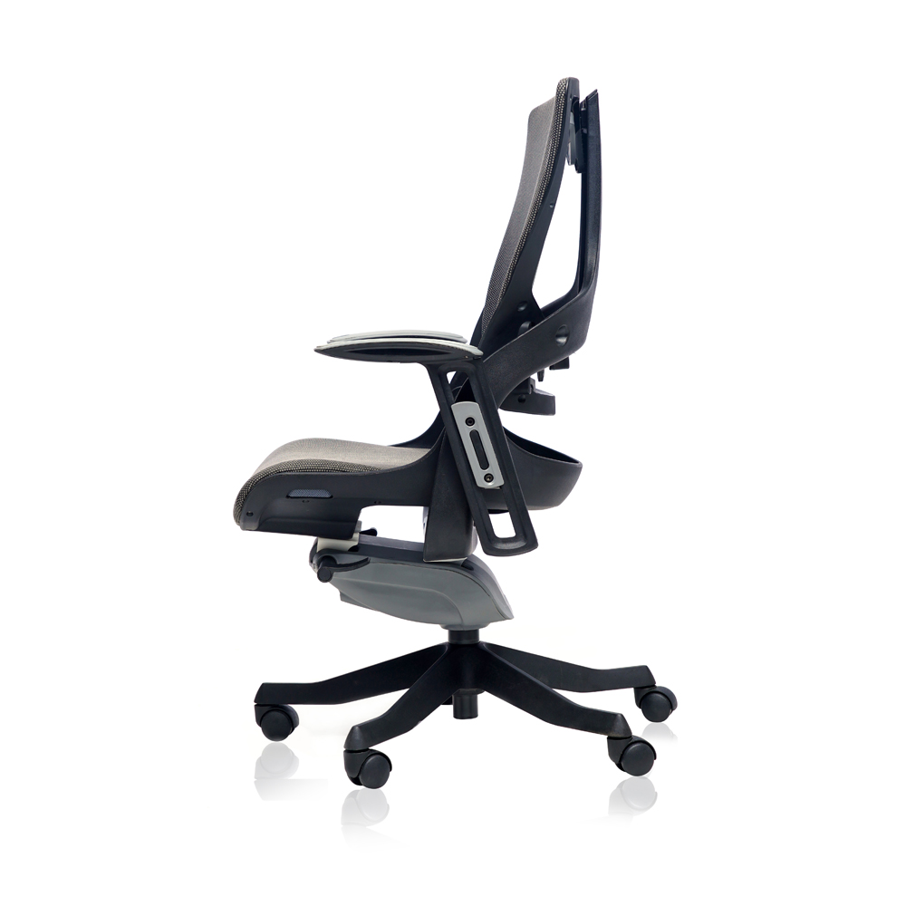 High back chair with recline-glide motion mechanism with multiple locking systems, mesh back with extra lumber support, adjustable armrest in grey color gas lift for height adjustment and nylon base with castors.