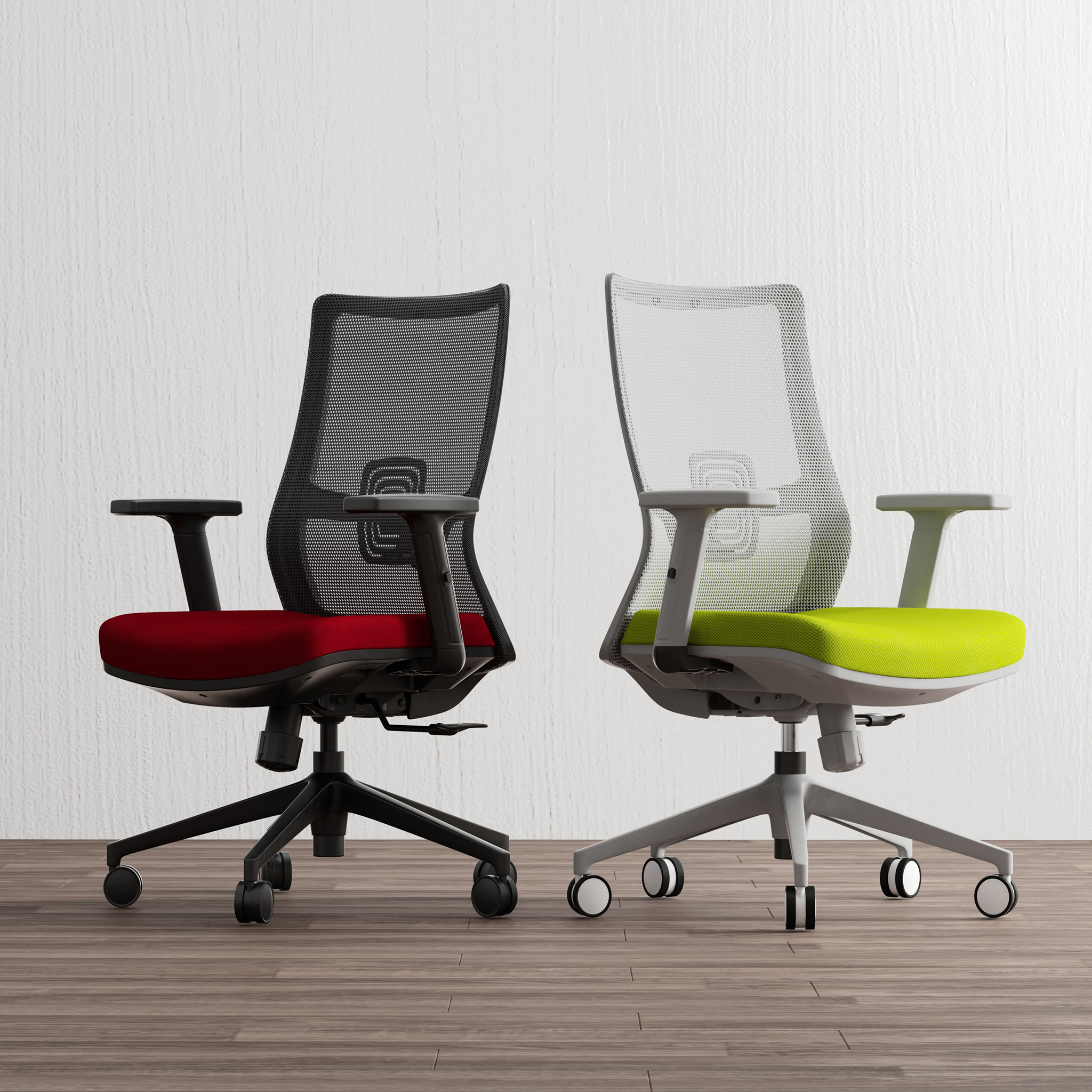 High back chair with recline-glide motion mechanism with multiple locking systems, mesh back with extra lumber support, adjustable armrest in grey color gas lift for height adjustment and nylon base with castors.