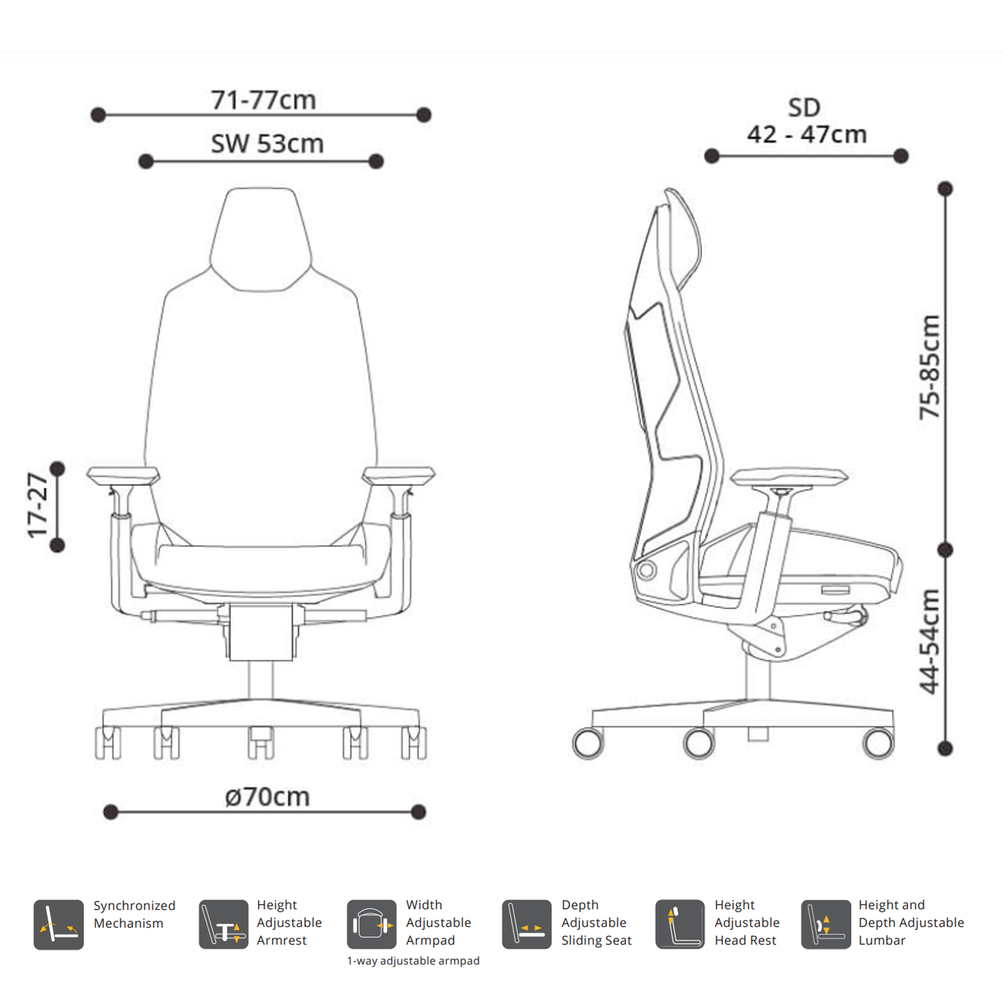 3. Seat : Sports car-inspired seat cushion Upholstered with “RIBS” polyester sandwich Grey mesh . Adjustable for 10cm height and 5cm depth.