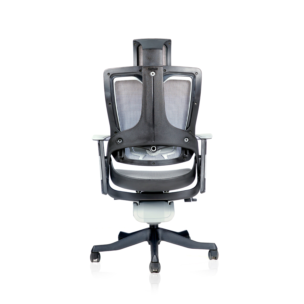 High back chair with recline-glide motion mechanism with multiple locking systems, mesh back with extra lumber support, adjustable armrest in grey color gas lift for height adjustment and nylon base with castors.